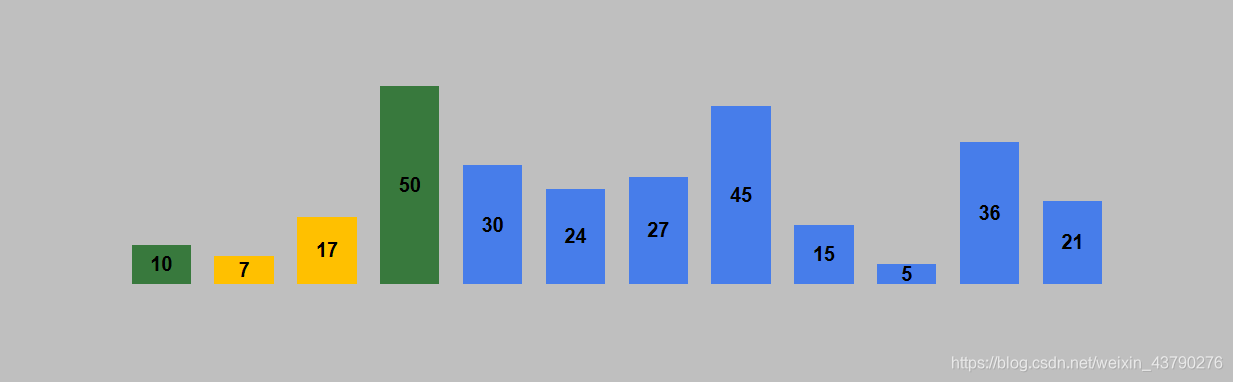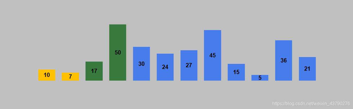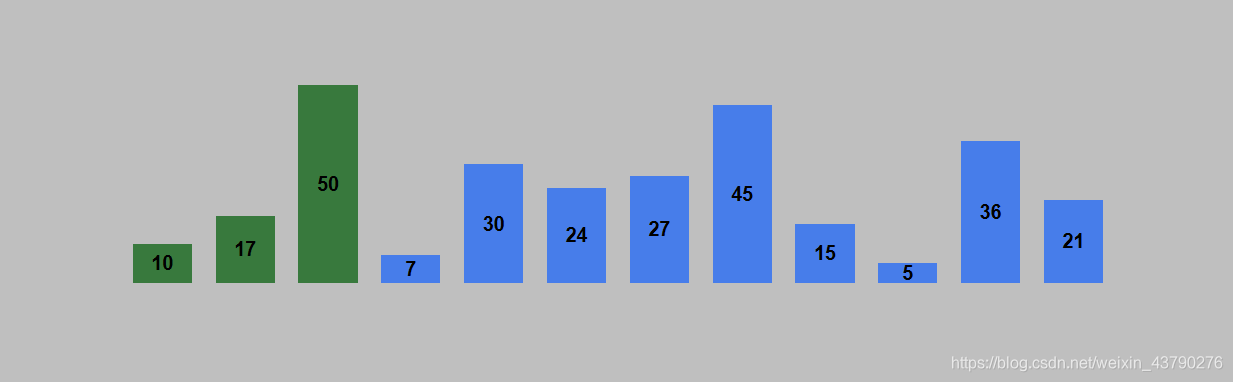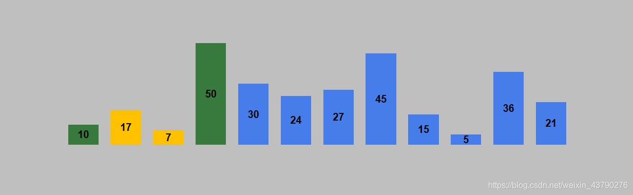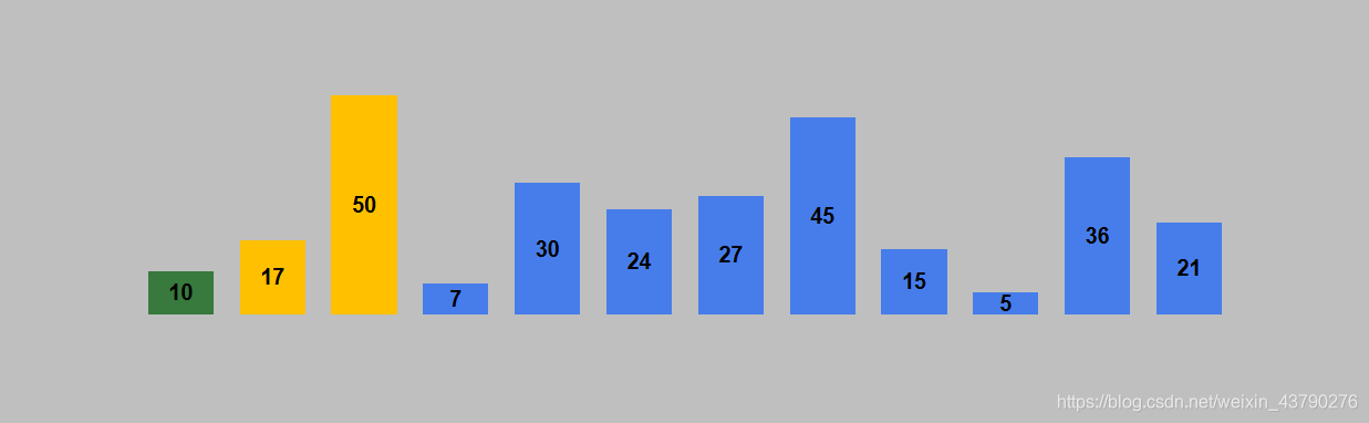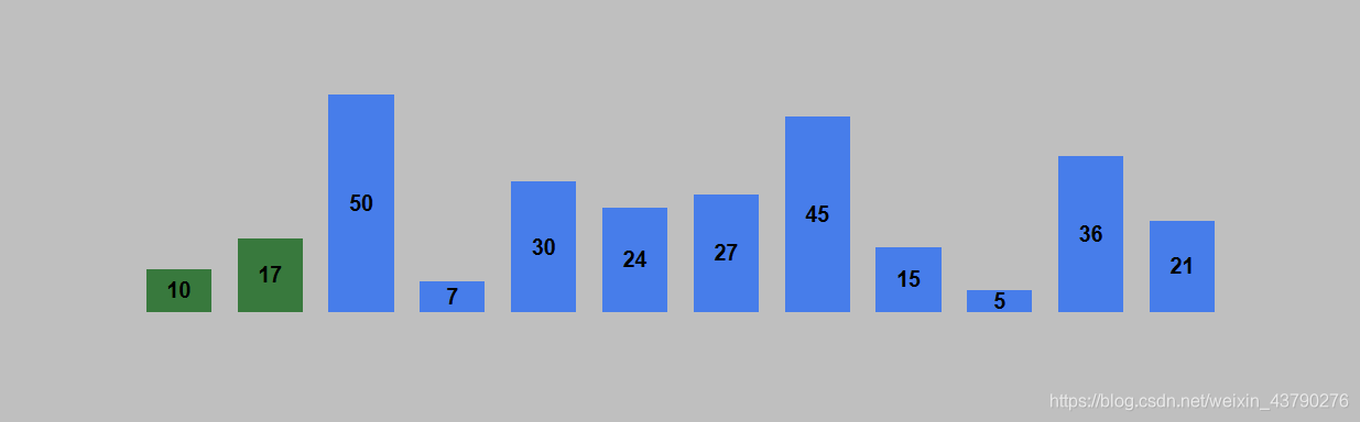 以列表 [10, 17, 50, 7, 30, 24, 27, 45, 15, 5, 36, 21] 进行升序排列为例。列表的初始状态如下图。
